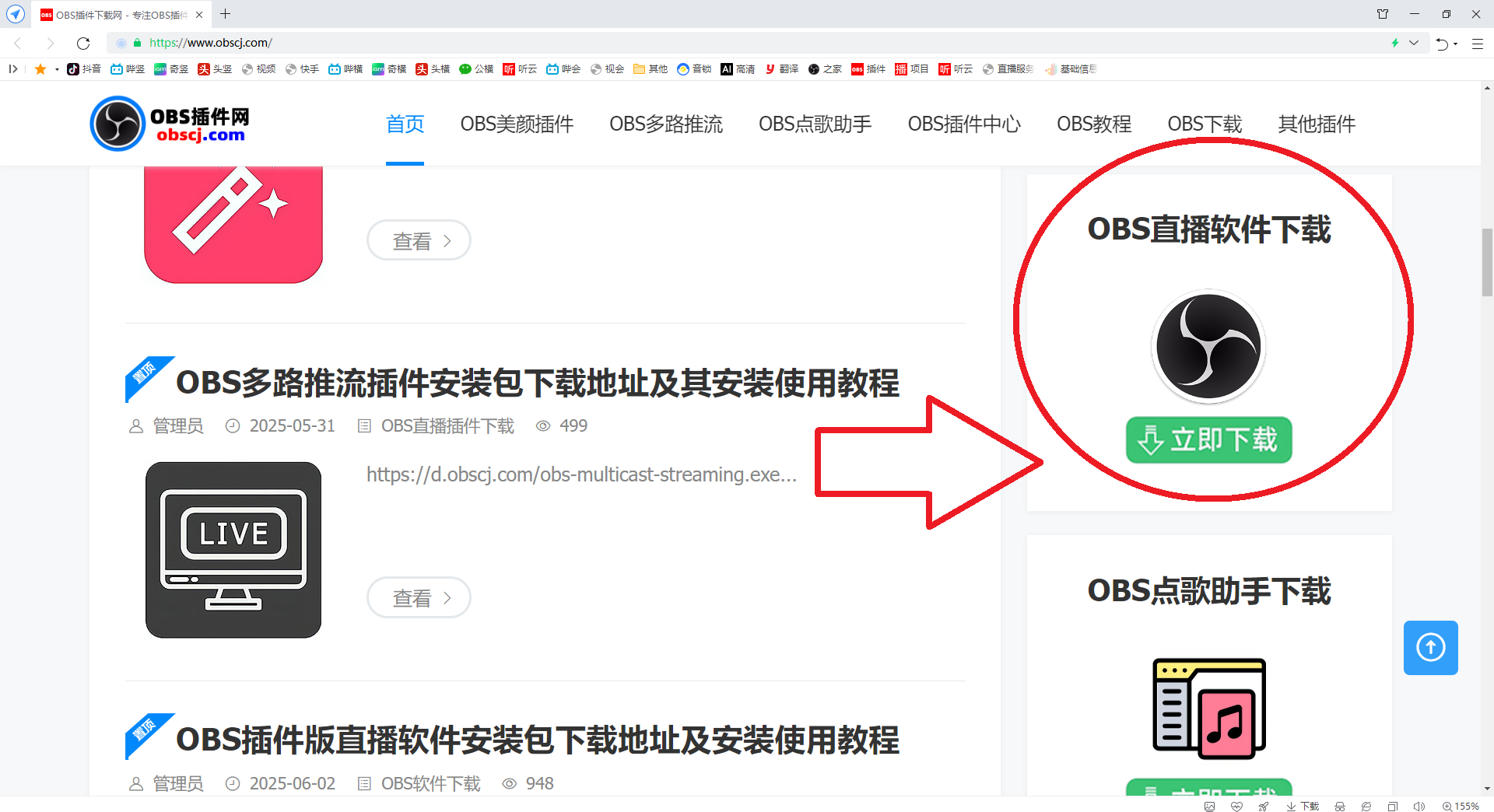打开OBS插件网 www.obscj.com 打开之后,找下图红色圈圈的位置,点击绿色按钮立即下载,下载完成后安装完成即可。